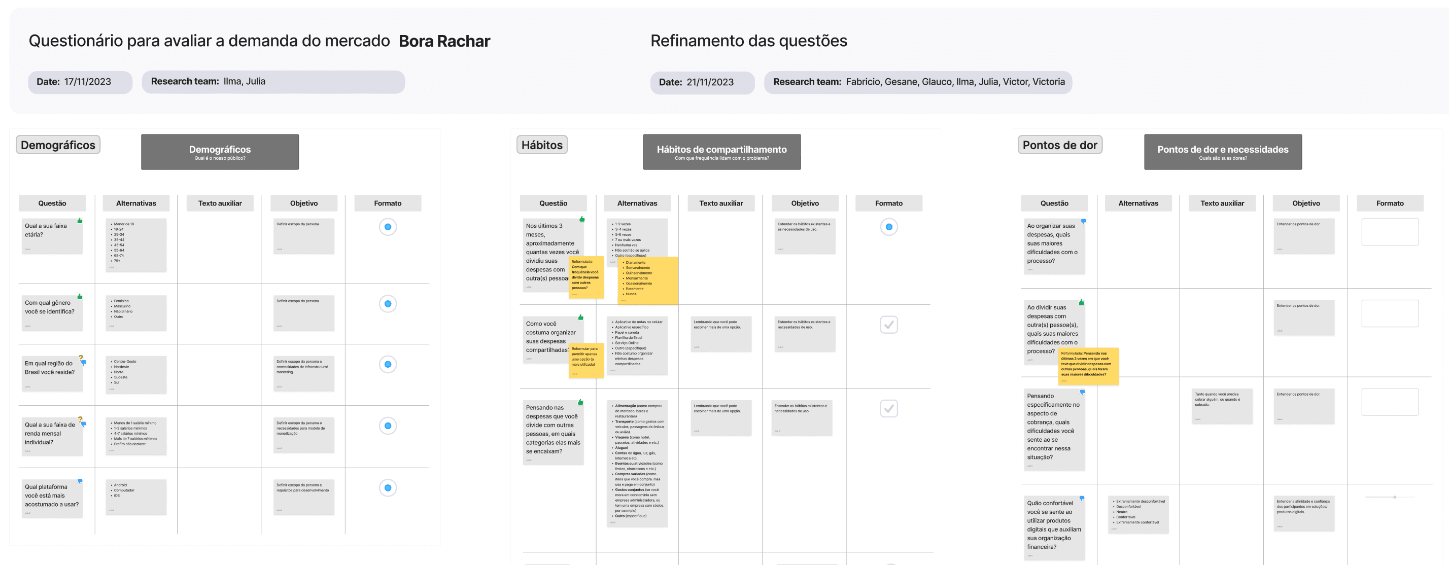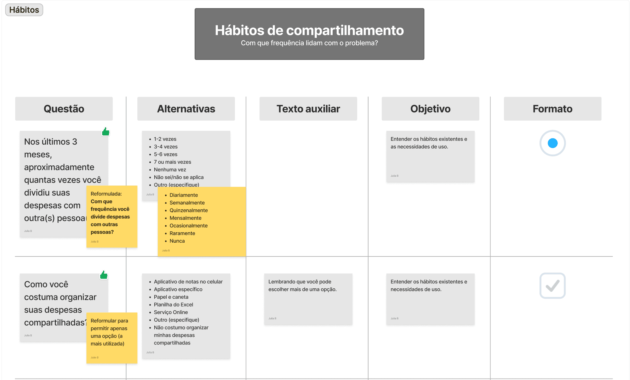 Definidos os temas gerais, segui com a ideação das perguntas em si. Fiz uma pesquisa em artigos da NNGroup e me inspirei em outros formulários para criar questões enquadradas nos diferentes temas escolhidos. Montei as questões primeiramente em um quadro com sua anatomia e deixando claro o objetivo que queríamos alcançar.