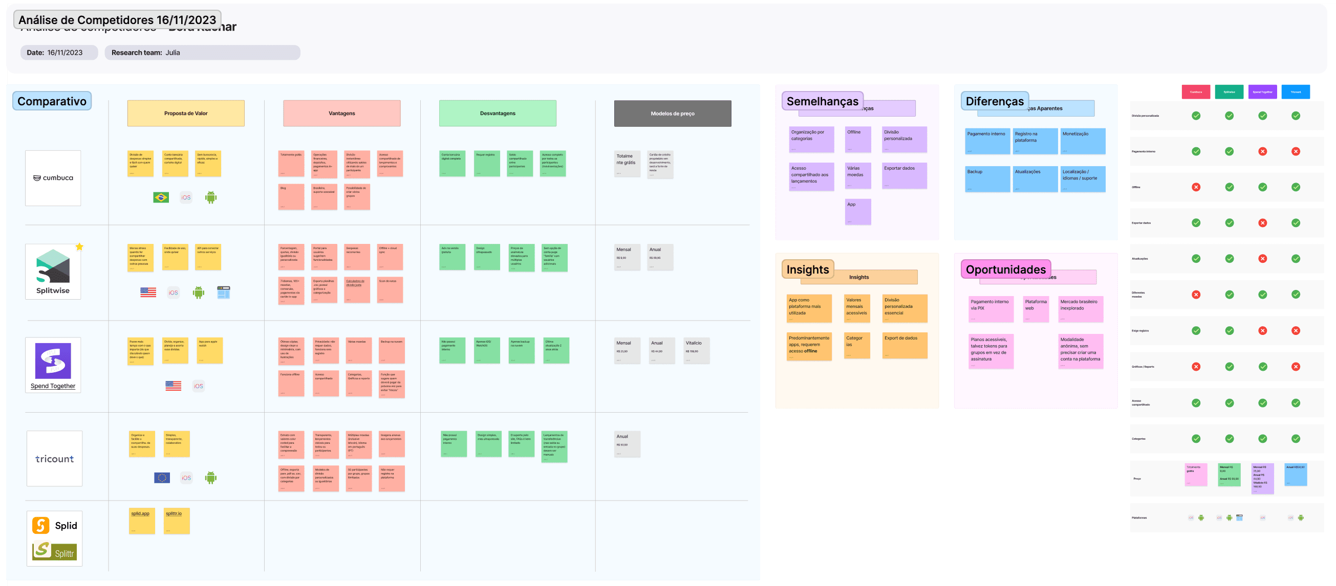 Eu me encarreguei de elaborar um benchmark, ou análise de competidores, para ter uma ideia de como era o mercado atual. Encontrei 2 grandes competidores e avaliei também dois produtos menores, mas que poderiam trazer bons insights sobre funcionalidades e práticas que já funcionavam no mercado.