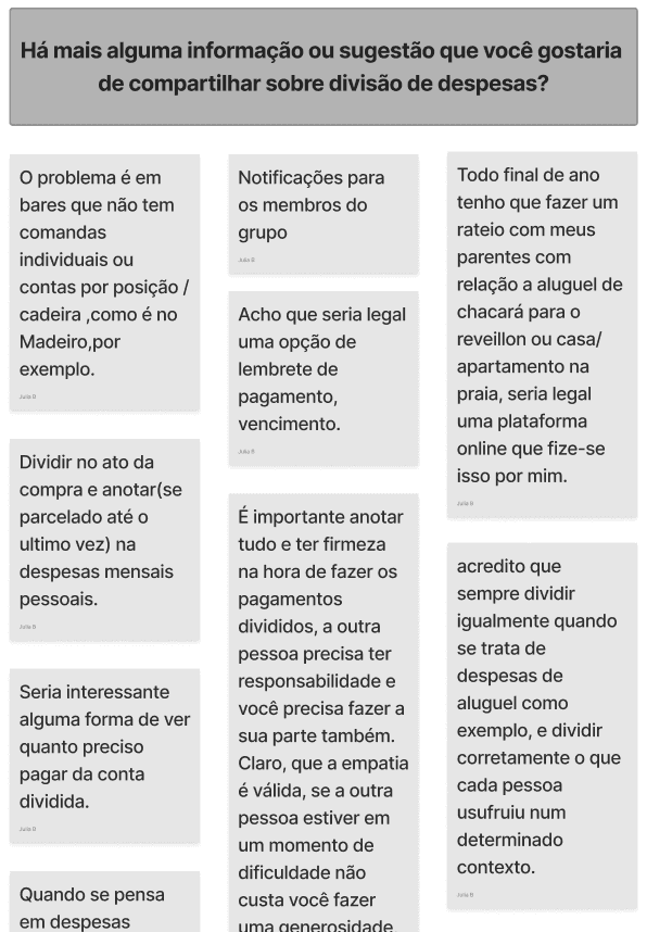Concluímos que as pessoas de fato costumavam dividir despesas e que encontravam dificuldades ao passar por esse processo.