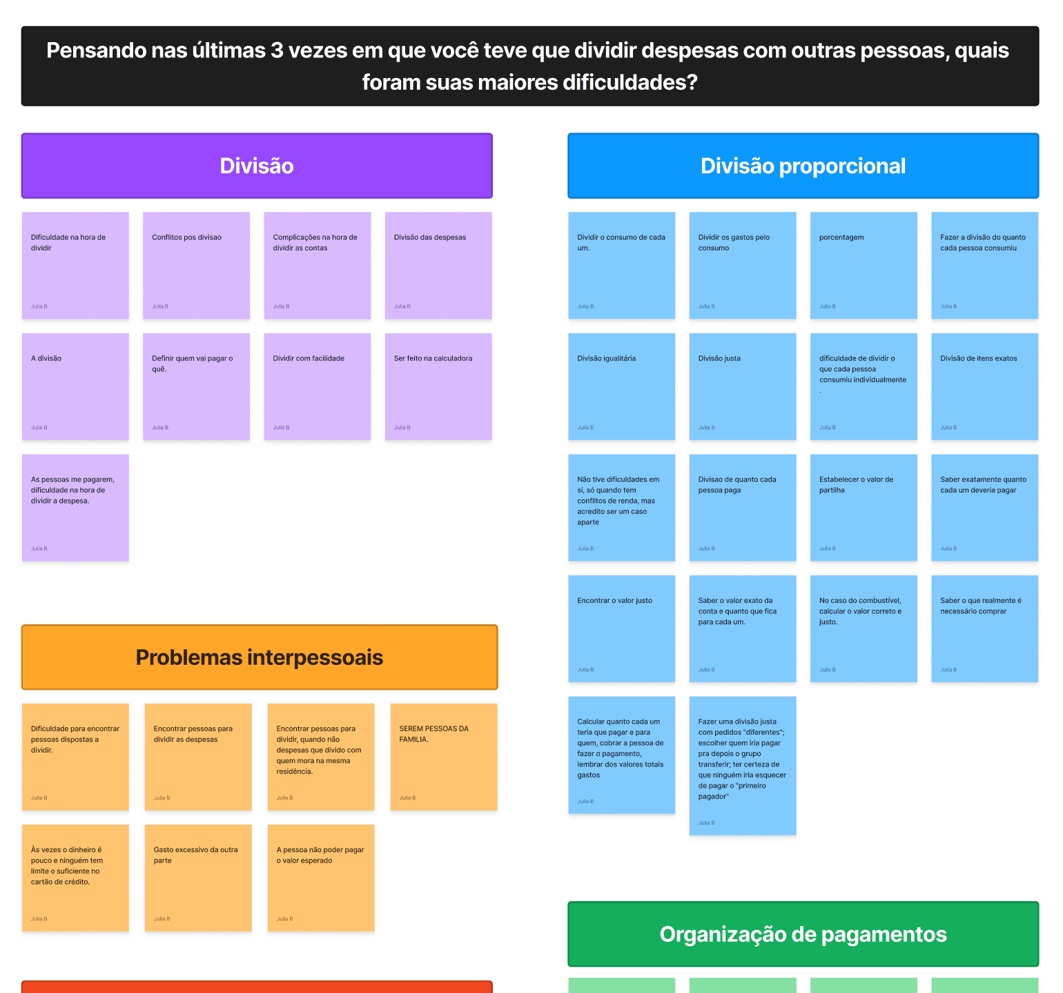 Separei os resultados em post-its e categorizei todas as respostas por popularidade utilizando cores de semáforo, para facilitar a visualização, e em rosa, respostas abertas fornecidas pelos participantes.