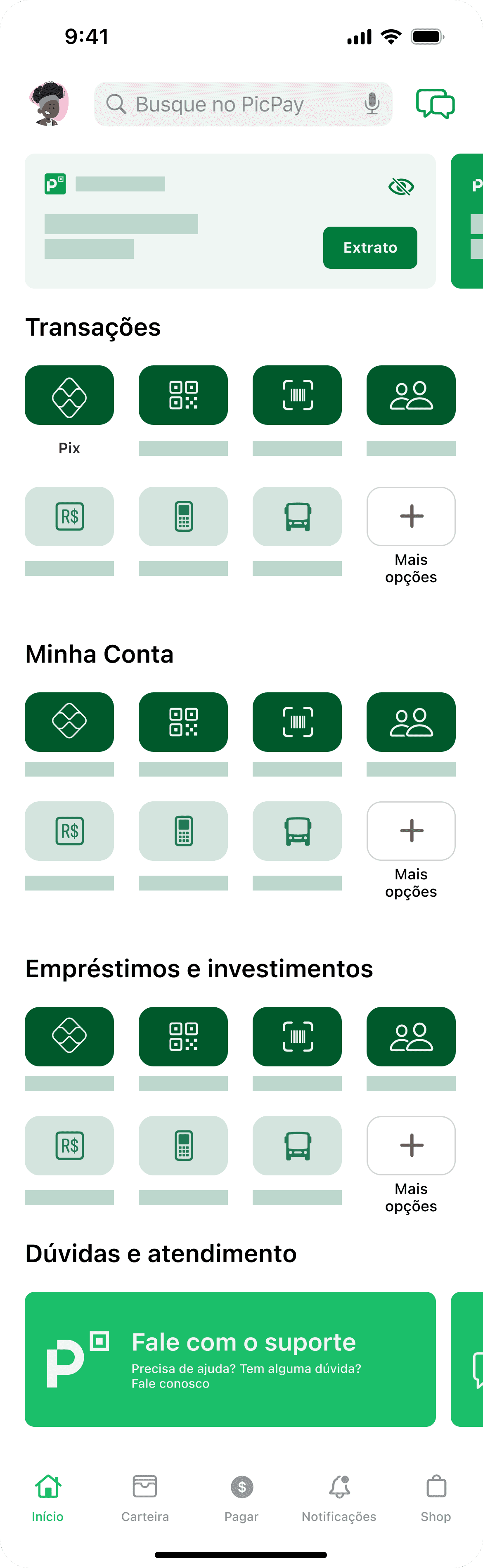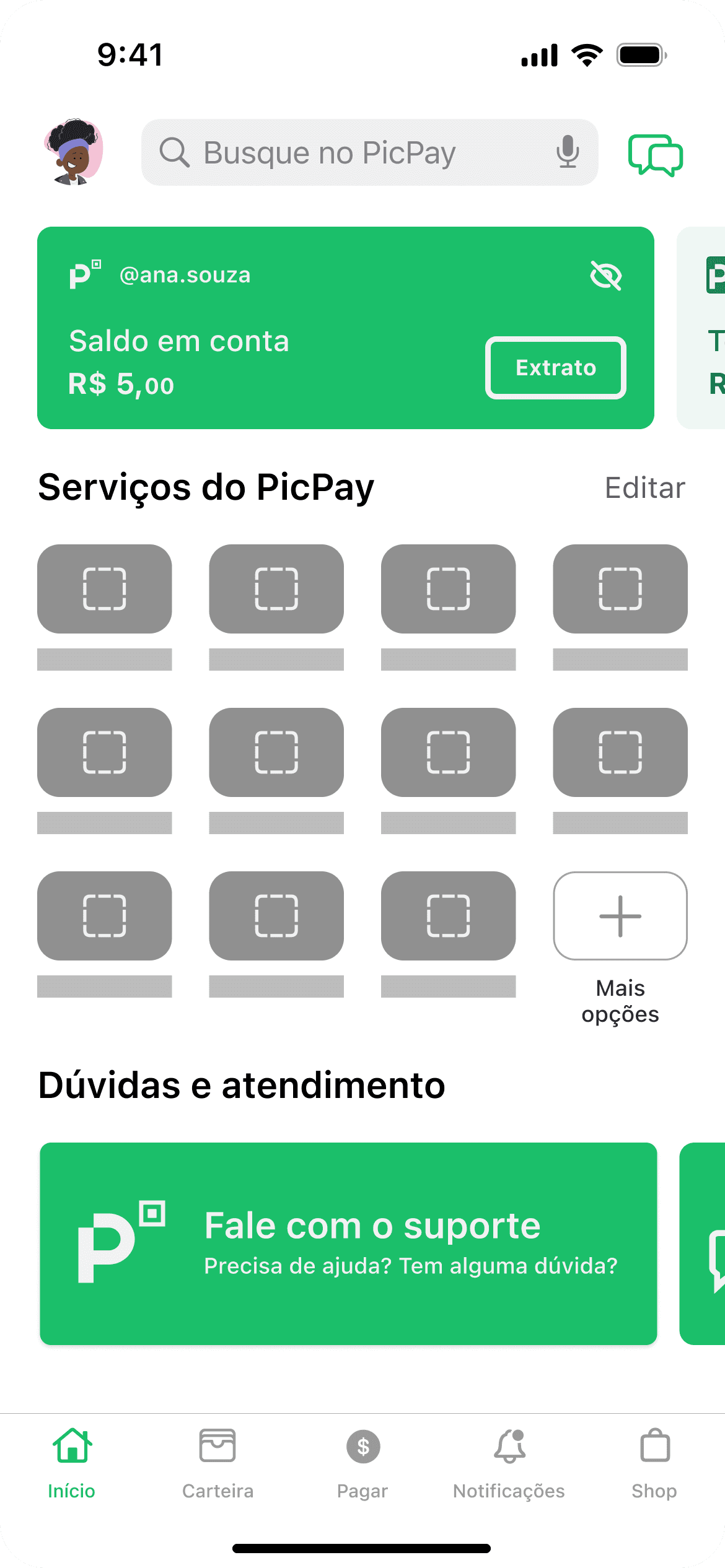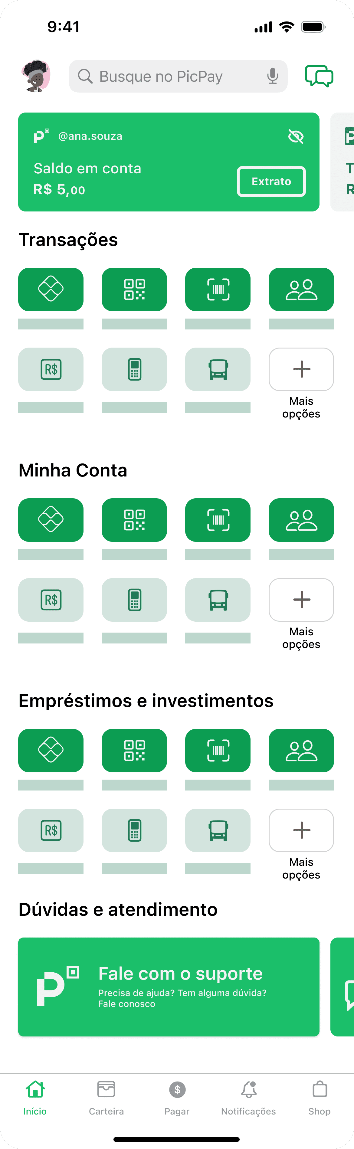 No design atual, apenas o ícone de perfil e o item "mais opções” levam ao contato com o suporte.