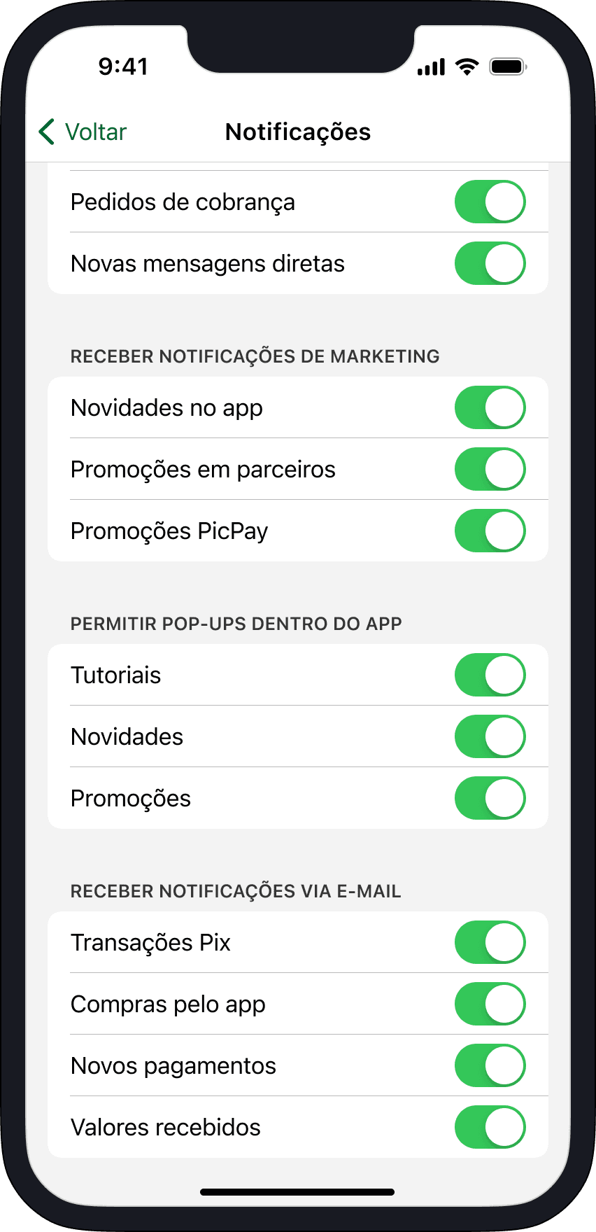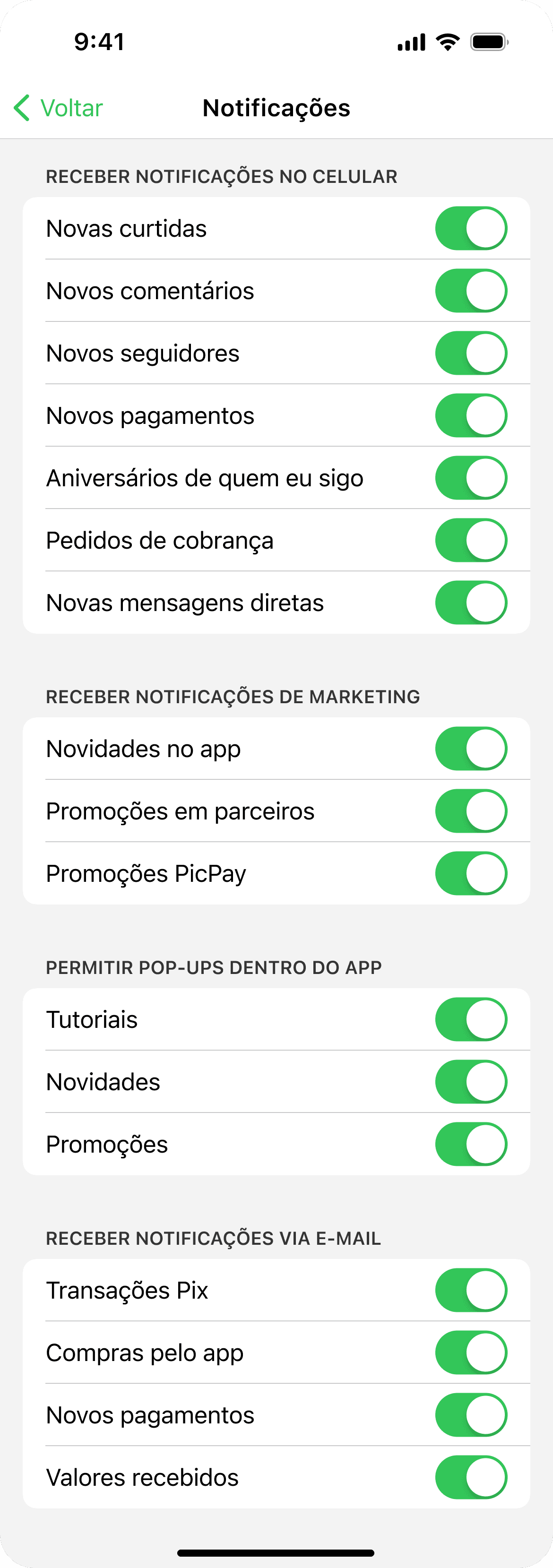 Adicionadas seções para preferências de marketing e pop-ups que aparecem durante o uso do app.