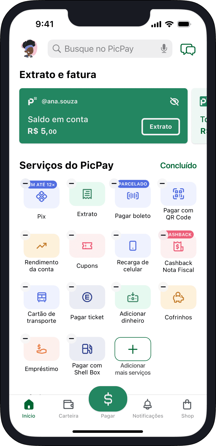 Agora totalmente personalizada pelo usuário, a tela inicial apresenta apenas os serviços desejados