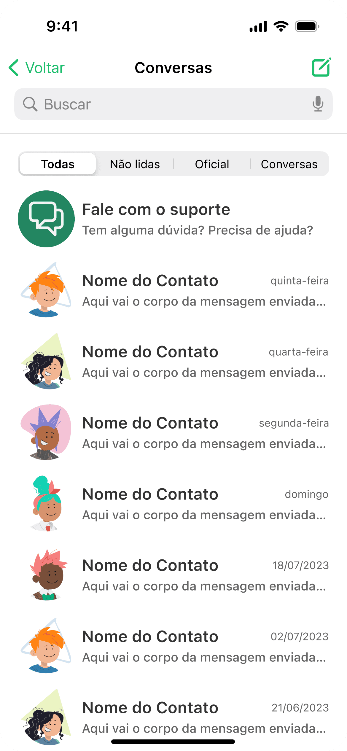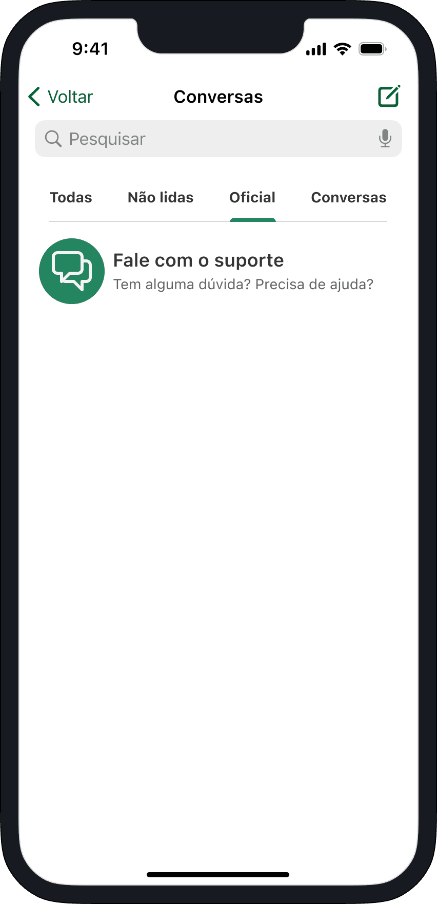 A tela de chat conta agora com um canal fixo de contato ao suporte. O chat mantém todo o histórico de tickets do usuário, fornecendo fácil acesso.