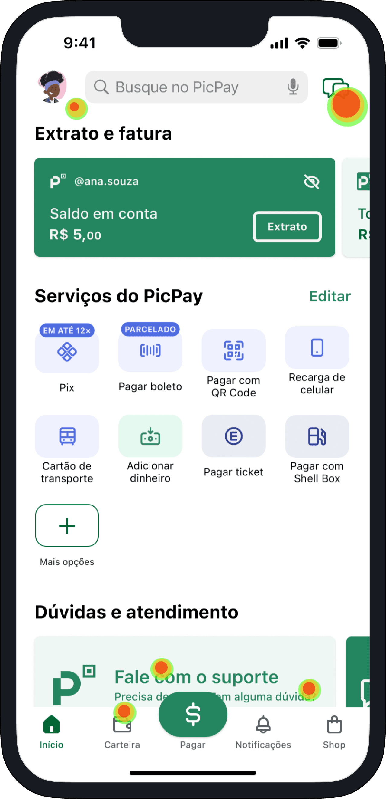 A decisão de colocar um canal fixo de acesso ao suporte foi acertada, já que em ambos os testes, e em ambos os fluxos, o ícone de mensagens foi o mais clicado.