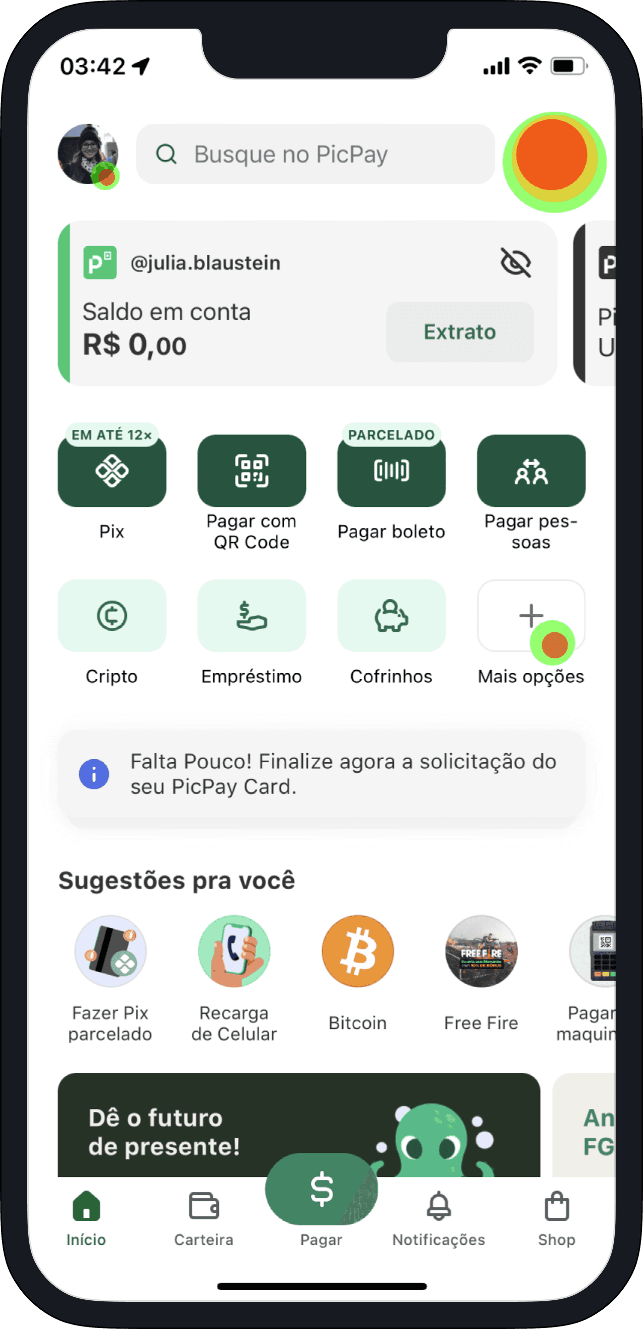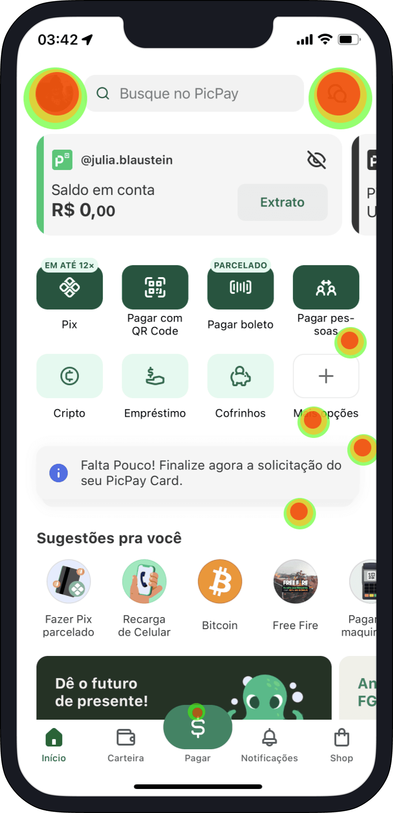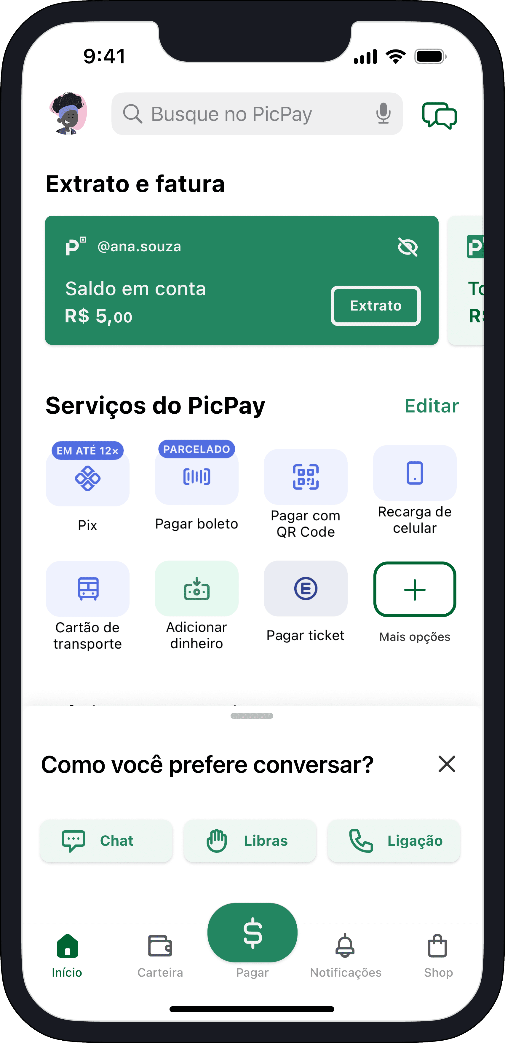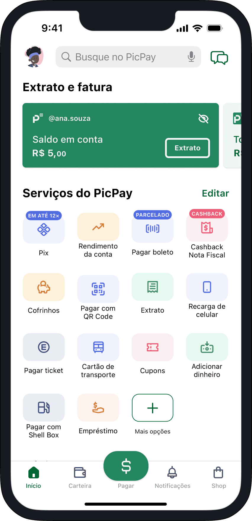 Ana abre o app e clica na aba "pagar”.