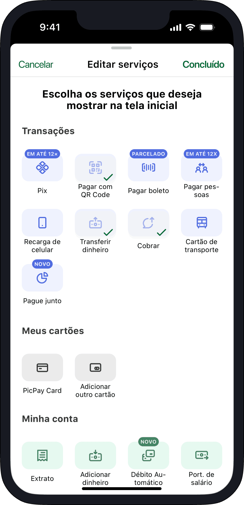 Mostra todos os serviços disponíveis e permite selecionar os ícones apresentados na tela inicial.